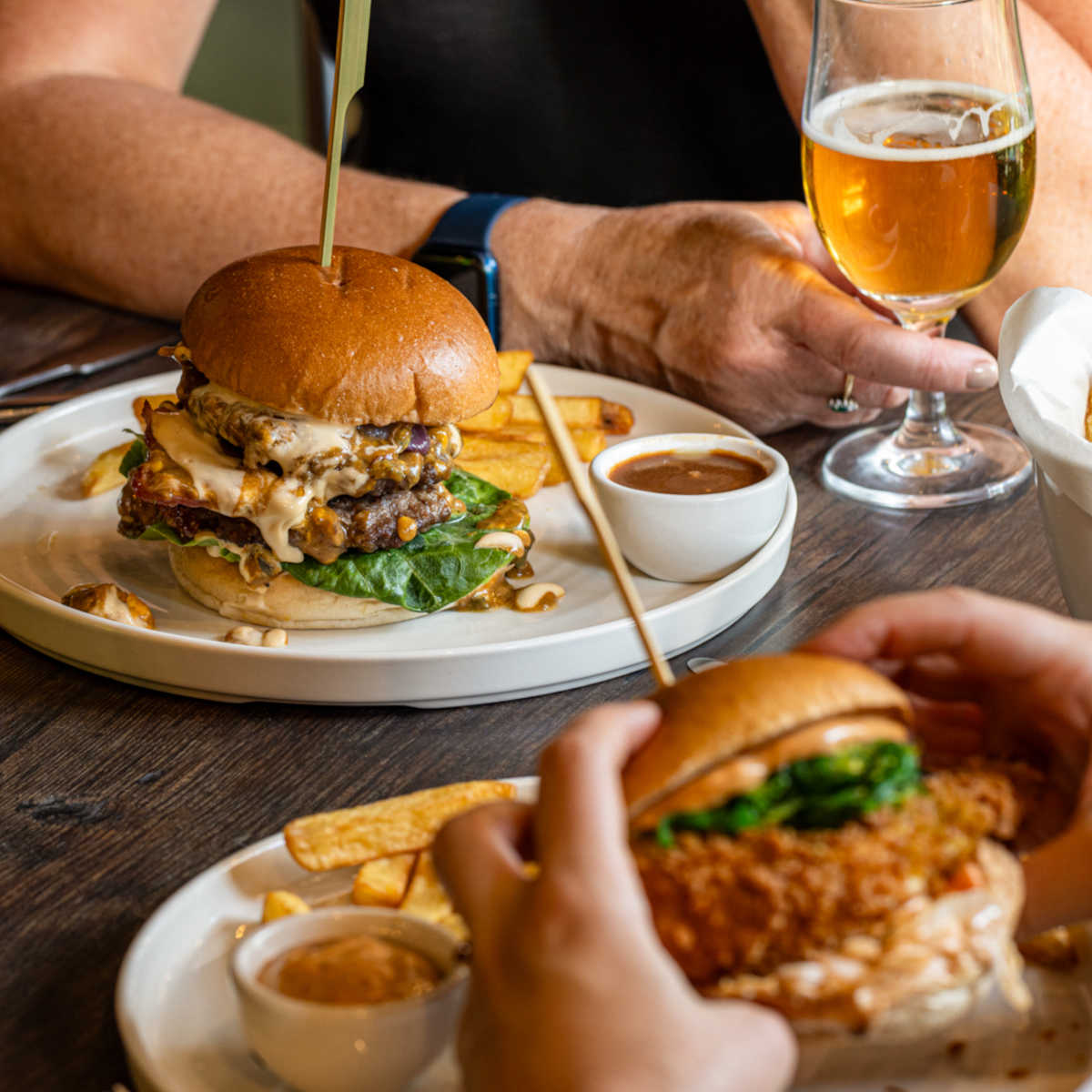 Double beef burger, smoked cheese, bacon, house sauce, skin-on chips | 17.5 1250 kcals